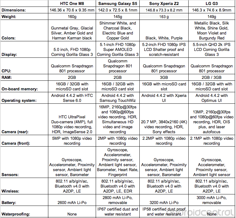 LG G3 fata in fata cu Samsung Galaxy S5, HTC One M8, Sony Xperia Z2. Tabel comparativ